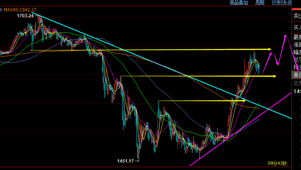 昨日黄金总体延续了一波较为强势的拉升,最高触及1627一线,当然各个平台都可能不一致,也就是说1608昨日强调的618分割位置直接上破站稳,并且指出1608攻破,下一个是1645,果然今日早间开盘先延续一波拉升,最高触及1643,已然逼近;接下来走势该如何判断:第一,周线级别短期均线是死叉中,但本周借助避险功能强势拉升,价格已经远于死叉点之上,密切关注本周收盘位置,处于死叉点上方,那么延续这一波走强,下周有望试探1700了,而冲高回到死叉下方,就说明指价背驰而回落,那么下周还有待商榷,会有一个围绕1600上下反复折腾的选择过程;第二,日线级别已经连阳发展,从1455底部开始一路强攻,可以作为一轮单边多头拉升,不排除一路借助市场避险而突破1704前高点,操作上继续顺势而为,做多为主;当日线只有单阳发展时,可以作为短期反弹修正对待,还没改变之前的一波单边下跌,但连阳发展了,并且力度迅猛,就要及时改变思路,顺应多头来发展;第三,小时线图,作为单边模式,一般延续短期均线5日和10日一路发展破高,今日早间冲高后回落,也只是短期的自我修正,下方依托中轨稳定后会继续上攻,建议以1600作为支撑点,继续维持看涨节奏,具体策略也不给出了,每个平台报价都不同,多观望少下手,做白银来代替黄金即可,同样收益丰厚;