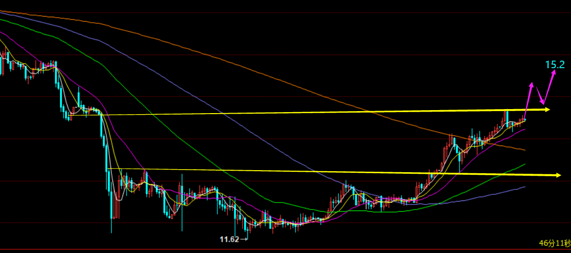 这几日黄金做不了,可以以白银来代替,走势上也开始了一波走强拉升,13.2关键压力被上破后,迎来一片春天,这也是之前强调的一点;昨日欧盘经过了一次大洗盘,从14.1至13.1再破高,这应该是急速确认了13.2突破口,为后市的上涨之路埋下坚定的基础,今日早间和黄金一致,冲高回落,14.15-14.2一线出现了支撑反弹,以此作为支撑点,今日继续逢低去做多,上方阻力要关注15.2压力,过程比较慢,一步一个脚印,毕竟避险属性没黄金强;