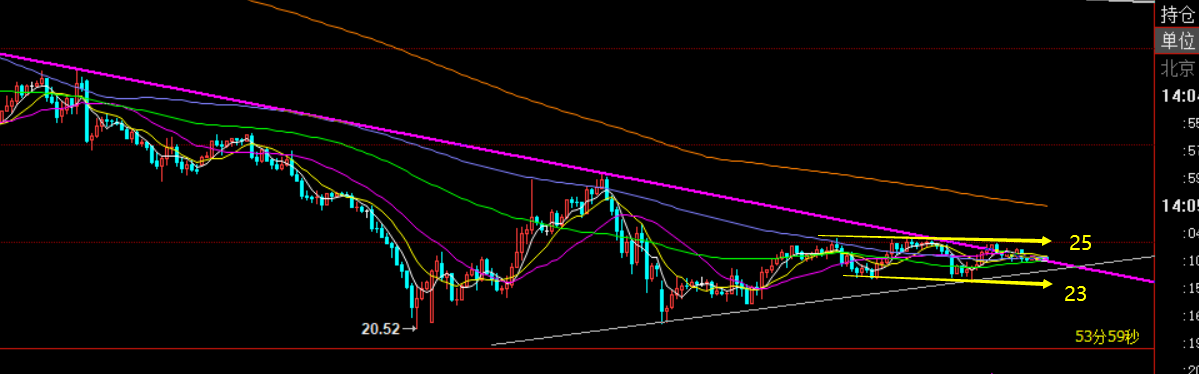 本周初这三天围绕23-25小区间来回过山车了几次,循环魔咒还未打破,基本是半夜拉升一波,第二天亚盘并不延续反弹,而是高位横盘整理,欧盘下跌一波,晚上再企稳上拉,也只能耐心等区间内有效突破来引导后市进一步的方向;从日线级别压制10日下方运行,整体的趋势还是相对弱,而从4小时级别,macd不断底部放量上行,价格低位横盘死撑,也存在一波背驰酝酿的急拉修正;从小时线级别,趋势通道压力有所突破,不过是横盘上破,并非连阳突破站上,还存在不确定性,笔者预计原油还是存在一波急拉的修正过程,指向26-26.6位置应该问题不大,就得靠耐力,下方守住23,逢低看涨,若今天欧盘又下滑,那么耐心等美盘22点后再择机企稳低多,遵循时间拉升循环;