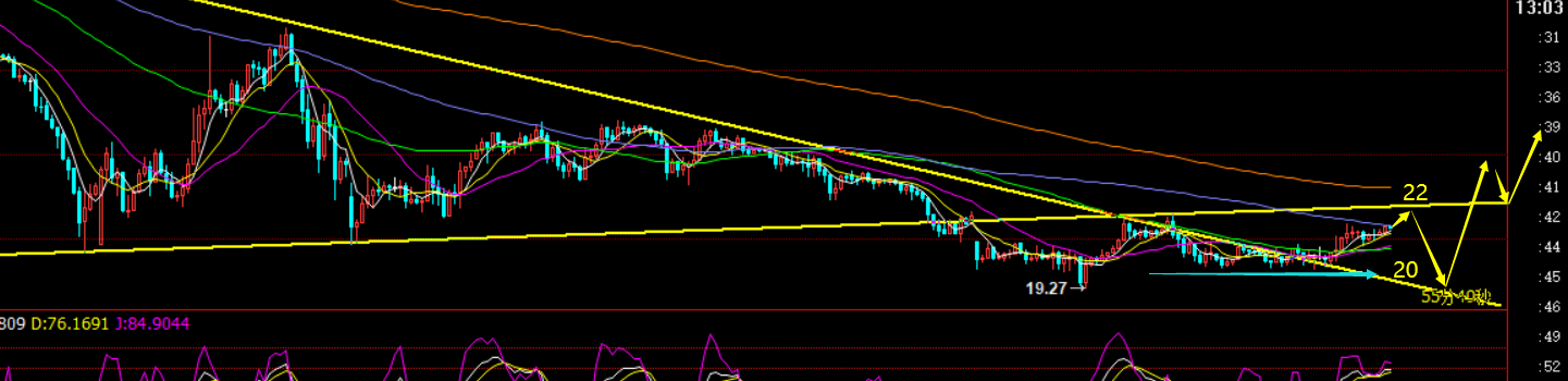 昨日原油一直坚守20关口横盘整理,半夜突破了21阻力位,晚间EIA库存大幅利空的情况下还是无法下挫,4小时macd进一步的酝酿背驰,这或许会给油价带来一定的反弹修正需求,不过日线形态还是偏弱,连阴单阳模式,且最后一次下跌阻力21.8-22一直未突破,也存在压制下滑继续低位徘徊,今日可以多观察下,21.8-22若触及压制,还是可以高空,破22择机回测调仓,下方 看20.8、20; 若突破22上行了,则思路要及时改变,回测跟多看一波反弹修正,可以看25一线;日线macd底部开始金叉了,低位不好再去追空,谨防修正出现;总结:倾向于回测20逢低去做多,看一波反弹修正至25一线; 或者突破22了,回测跟多看25; 对于高空目前来看,只能参考21.8-22阻力压制才会考虑,跌下去就不去跟空追空了,防止又是底部横盘半天不跌;对于原油,还需要多观望,耐心等信号;