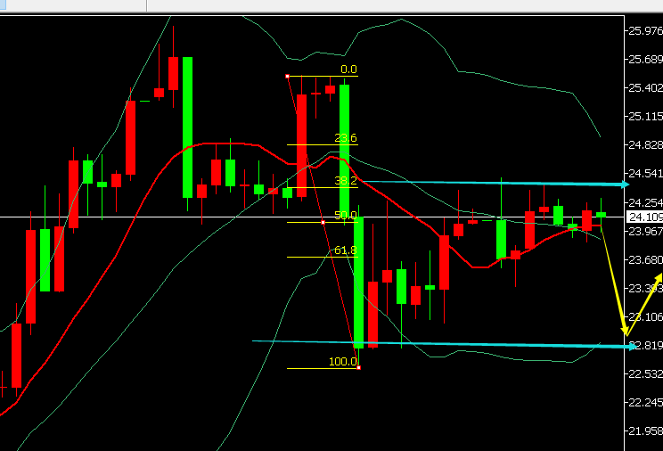 昨日算是完美成功把握住了短期的多空变盘拐点,暂时结束了前期一路逼空的上涨,仍旧要记住一点:大趋势空头一直存在,一直未曾改变,一路的连阳逼空上行可以剿灭不少空头持仓,最终忍不住了反手去跟多,结果来了昨日的大幅下跌,一车拉走高位的持仓多单,不过好在半夜并未持续性下跌走弱,而是再一次步入了箱体的区间横盘,因此今日又面临了一定的多空选择:第一,24.6-24.5是现在的横盘压制点,突破上行,则昨日短期下跌结束,继续上涨破高概率就加大;第二,23破位失守走跌,则调整下行延续,继续剿灭多头持仓,毕竟昨日的力度说大也不大,只有18美元跌破了,绝大多数的多头就成功被覆灭,目前来看还需争夺;从当前行情看,既然是横盘,只能耐心等上下突破,因为隔夜是下跌,今日先考虑的还是先高空,24.6-24.5作为防守,先空,看欧盘能否下行,若下跌不了或选择突破防守,则美盘要回测去跟多,一旦欧盘下去了,关键支撑集中23-22.5区域;