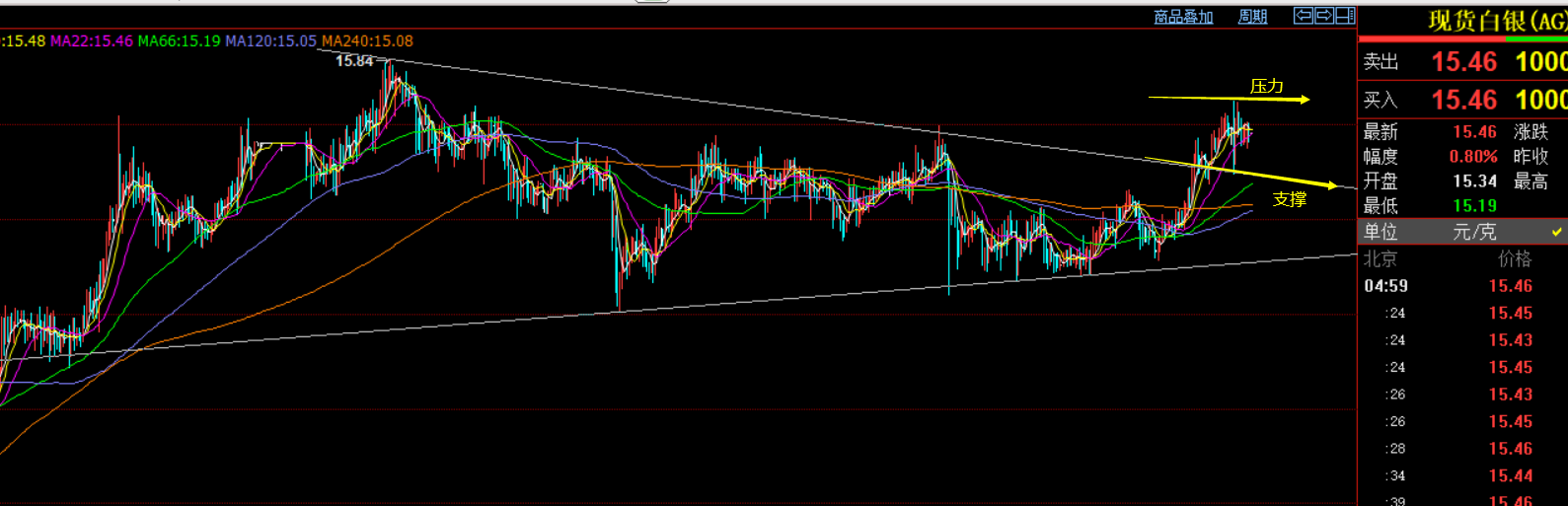 白银周评:有一段时间未给出白银单子了,这是因为黄金处于震荡,白银会更加的震荡,而事实来讲,白银这几天走的比黄金有所抗跌,下周关注15.6压力,支撑15.2,此区间震荡来对待;