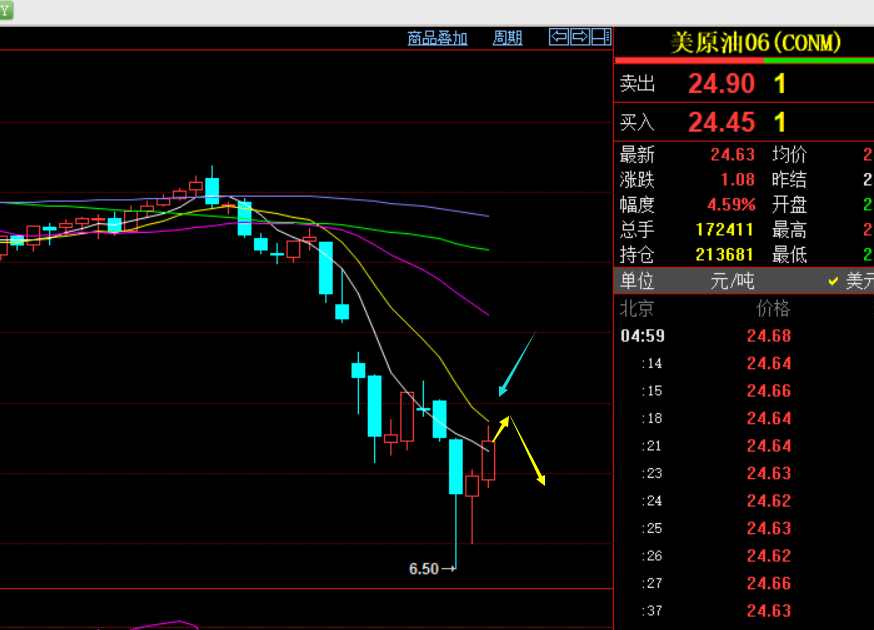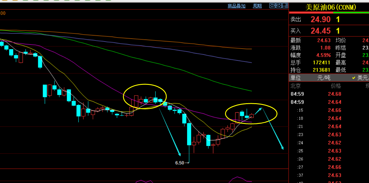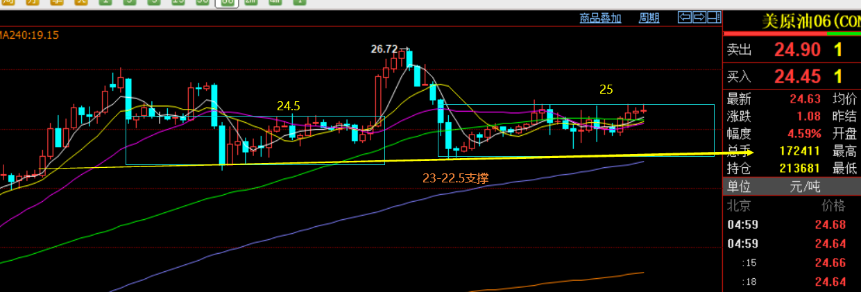 原油小时线图:高位整理洗盘反复,节点支撑23-22.5,破位这里才能结束见顶,阻力25、26、27都存在压制,拉高建议高空为主;