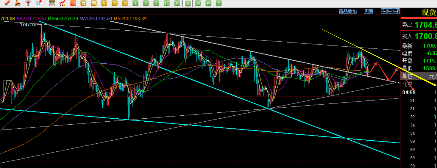 而小时线走势图,是对于日线图的细分,以通道原则来精准对待,周五半夜冲高震荡回落至1700一线,下周一1698处下轨支撑存在反弹,不宜追空,可以适当短多,上看1710及上方,也是中轴的一种确认,而1710及上方建议高空为主,因为1747、1738、1724已经形成了新的趋势压力线,而下轨的两个关键支撑点,目前集中1690和1677两个位置,随着时间的震荡延续,这两个点会随时细微改变;
