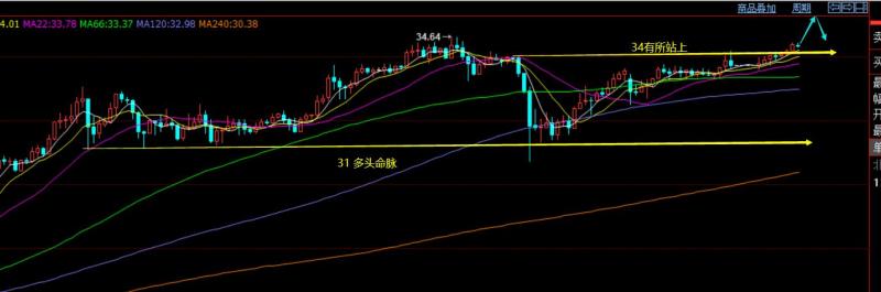 上周的一次大幅下挫跳水算是自我的一种修正,因为目前一路上涨又回到了34上方,这一次的逼空上涨还有望延续,下一个强压则是35-36.3,也是3月份跳空缺口后的开跌口,这里决定油价多空的再一次选择;周末计划昨日回测33跟多,但早盘又破位33就不敢下手,午后企稳32.5再次反弹后,欧盘步入33.4上下 一字横盘,加上假期提前休市,就没去安排多单,收盘前价格如期还是上涨了一波,今日延续了反弹过程,那么短期来讲,原油依旧很抗跌,操作上跟随做多,今日起涨点是33.6,以此作为防守,去看进一步的上行,阻力34.6,突破则可以冲击35及上方,而给到35上方就尽量少追多,需观察受压的力度再来决定;因为担心触碰强压,又会发生类似上周的大幅急跌下滑修正;