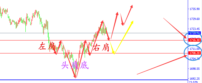 ①如图,底部短期形成比较明显的头肩底,操作上依靠肩膀下方1706/1708做多,目标看1715/1720/1726止损1700就可以了(小止损博取大利润)如图下头肩底。②上方前期压力附近1730/1728可尝试一波空单,目标拿5-6个点利润就好,搏回踩就不要贪了,止损3个点,毕竟是逆势单,没有必要③行情千变万化,操作上更多的是见招拆招,记住一点即可,回踩多,空单尽量回避,不要问再来问我为什么了,上面分析的非常透彻了,如果操作短线的同学这段时间也是经常出现严重的亏损,那么你需要总结下了,短线也操作不好的同学也可以联系我 sclc415寻求帮助,我尽量抽时间给你指导吧。