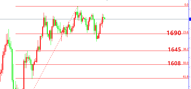 黄金分割:①黄金分割而言,以1450为起点,1765为终点,23.6%是1690(已经到达),38.2%是1645,50%是1608,都会有机会到达。②如果第二次向下破位23.6%的1690关口,那么直接跌到38.2%的1645附近概率会达到80%左右,本周的低点离38.2%1645关口相当接近,一般而言在使用黄金分割的时候,像这么接近的情况,一般而言都会默认要到达,这里的变数在于,这个黄金分割的测量只是个高度为315美金的波段涨势,临近的两个黄金分割位置之间距离并不远,从黄金分割的经验里来讲,纵深不够的时候,临近的两个黄金分割位的递进效果是较差的,近期投资出现亏损比较严重或者手上有套单不知道如何处理的朋友可以联系孙策老师 sclc415寻求帮助。③本月下旬如果价位还是处于23.6%上方,我们是要当心变盘,大幅度调整过程中久盘没跌,那么会有上涨倾向。