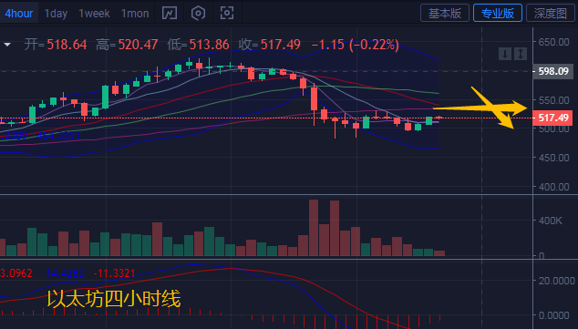 以太坊四小时级别来看,布林带张口下行,MA5和MA10走平运行,行情暂时稳定在520一线上下波动,附图中MACD快慢线逐渐走平在零轴下方,红色动能柱缩量,四小时级别,空头趋势有减弱迹象。日内重点关注上方530压制,破位则关注540附近。下方支撑500-490。汐柔建议操作高空低多即可。