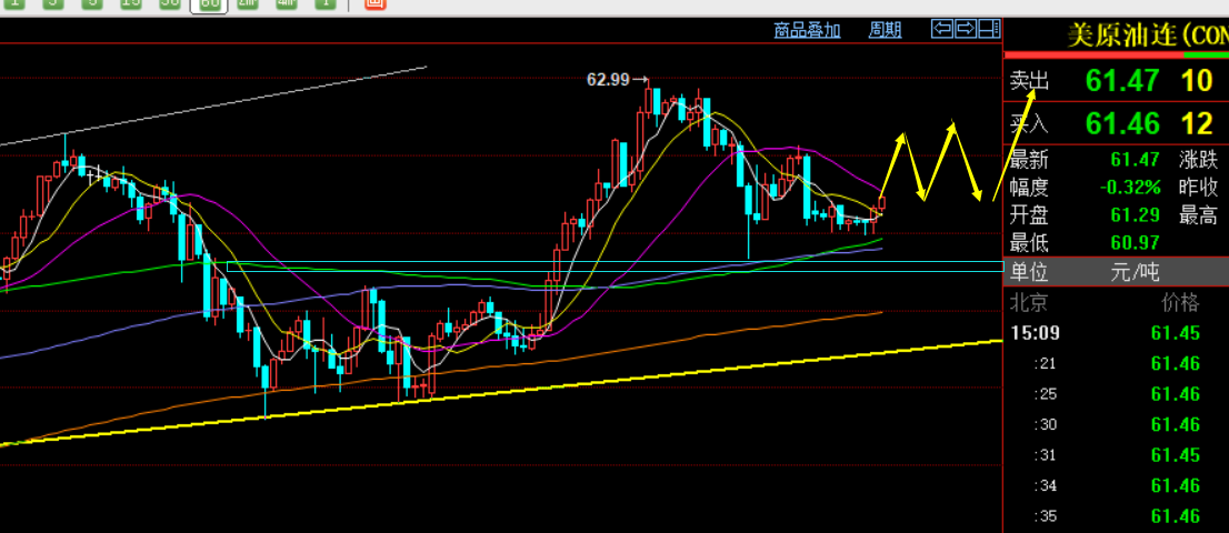 原油方面:昨日亚盘冲击很猛,一早就突破隔夜高点且拉升力度大,触及63一线关口,但欧盘也是冲高回落,美盘前后破位起涨点61.5就基本也是震荡对待,不宜急于跟多,一直等待美盘急跌至60.6出现支撑反抽后,介入了61.2短多,抵达61.8盈利;从日线级别短期还是偏强多头中,只不过每次破高,都容易产生短期几日的高位盘整,当前压力62-62.1,支撑60.8-60.6,区间内运行看得失,拉低还是先低多试探为主;