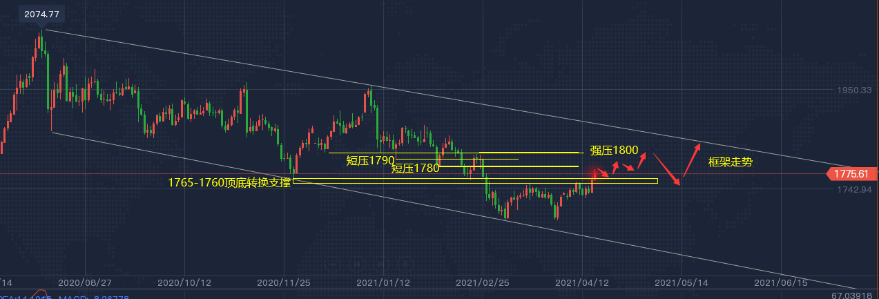 因此,下周我们暂时定的框架是1820-1765的大级别框架;回踩出现1765上下的走势,我们跟进多,上行靠近1815的均价附近选择估空的方向。日内的短线,我们下周每天都会跟进。以上就是对于下周的一个提前的思路分析,框架定位;周末的分析就是有备无患,同时给本周对行情走势捉摸不透的散户投资者找好路子,做好铺垫。