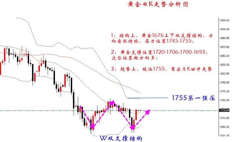 1:黄金日K的箱体1765-1725的区间破位,40美金的震荡箱体破位之后,短线会继续走高,按照1:1的基本比例计算,也就是1765+40=1805附近的高度差价;W底部结构的破位在持续,W底部的高度是1765+60=1825上下的位置;因此,我们得出的结论黄金会在1805-1825展开第二轮下跌调整;期间会逐步的震荡上行为主【因此这个阶段,回踩我们主多,上行1805-1825区间多单立出局,注意布局空单】