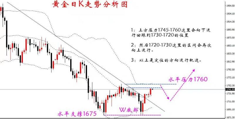 第二:黄金从1680的W底结构上涨,承压1760的压制;黄金擅自噶很难过,市场跟风,到达了1760的时候,很多人还在盲目看涨;也因为在1680-1760的上涨中止损了大量的空头头寸,才导致了市场在1750上下还是跟风看涨。【这期间,金浩说过黄金会承压1760上下的压制,重新调整到1730上下的位置】
