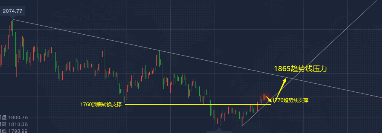2:4小时的盘面抗跌,上升通道运行良好,支撑位置1770附近。因此,在趋势通道支撑1770之上,则是保持看涨回升;