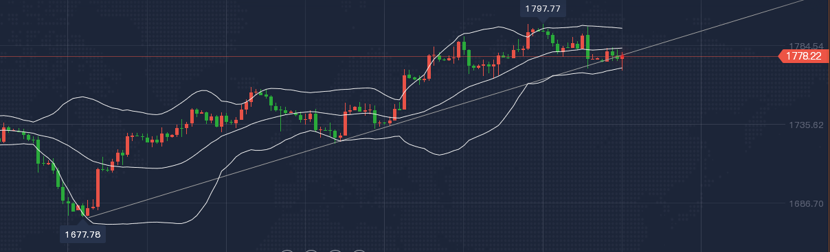 如图所示,4小时的支撑1770一线有效,因此暂时不会出现强势的持续下跌。其次是上升趋势通道边线被磨破,上升难以持续。因此,得出的结论很简单:做空暂时不能破1770,做多暂时不能破1790,因此形成的是1770-1790的区间震荡。所以这个阶段,看跌破位或者看涨破位是没有意义的。