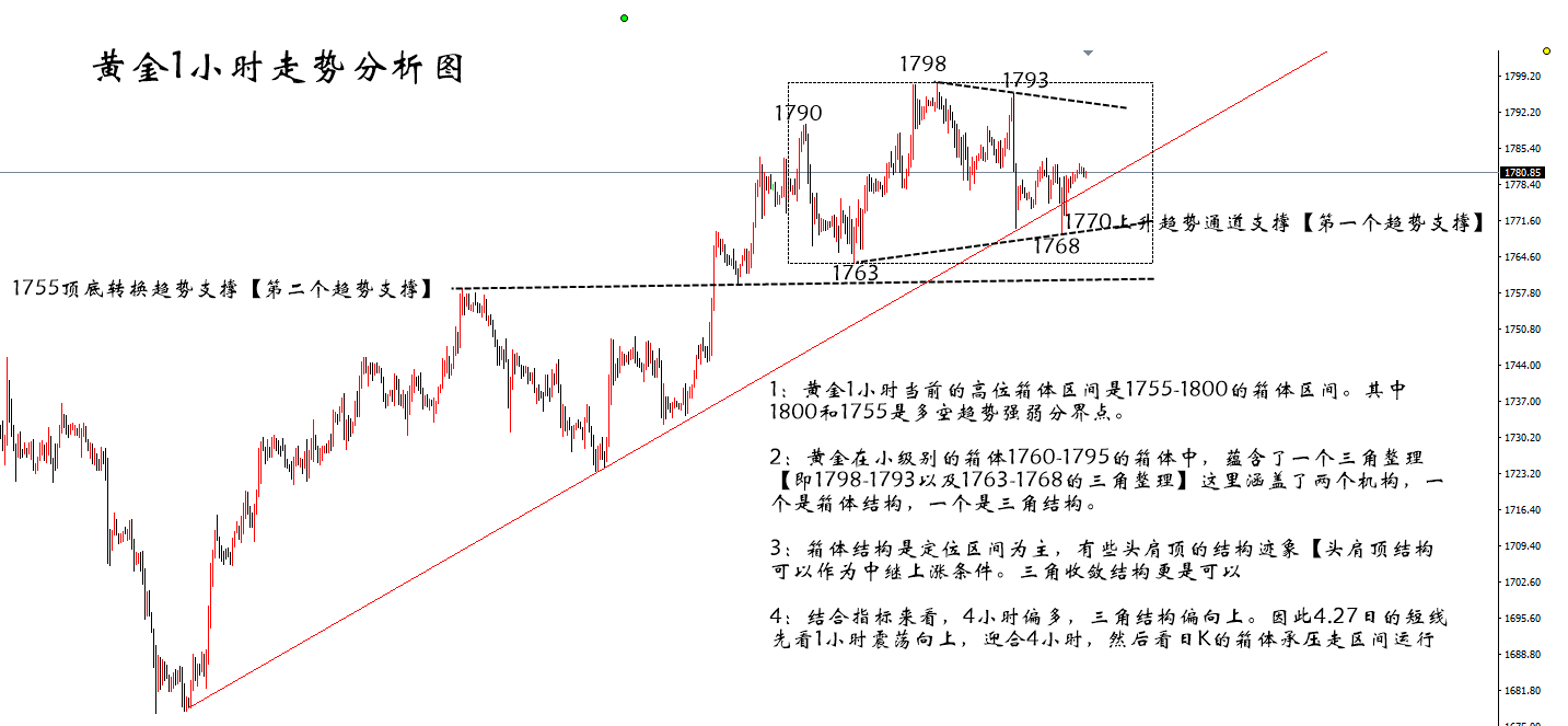 d:结合指标来看,4小时偏多,三角结构偏向上。因此4.27日的短线先看1小时震荡向上,迎合4小时,然后看日K的箱体承压走区间运行