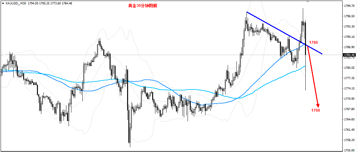 黄金多次上攻1800没有有效突破,黄金高位筑顶迹象明显,预计短期还是很难突破,今日晚间依托1790黄金空,黄金直接跌破均线,同时30分钟短线双重顶部,加上前几次的上涨,黄金都不能有效突破1800,黄金空头已经在1800一线构筑了铜墙铁壁,多头没有点金刚钻短期估计很难突破。
