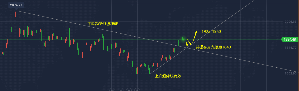 随着时间和价格关系的变化,目前就是到了1850上下的支撑位置;这里的回踩到了线就是直接做多的;因此今天的分水岭支撑位置就是1855支撑,上方的压力位置是1875和1890的位置;因此,黄金今天的区间是1855-1875的区间,大区间是1855-1890的区间;同时下破1855,趋势转空,可以持续跟空;上方1890二阶段做空。