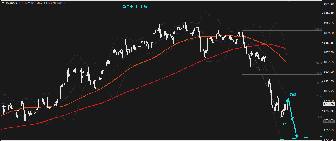 国际黄金美盘回撤1773附近企稳,盘中迎来一波强势拉升,盘中最高报1790,多头仍然没有走出很强的延续性。所以,笔者判断,目前的反弹仍然不过是技术层面的修正,并不是反转,金价整体走势依然是空头格局。