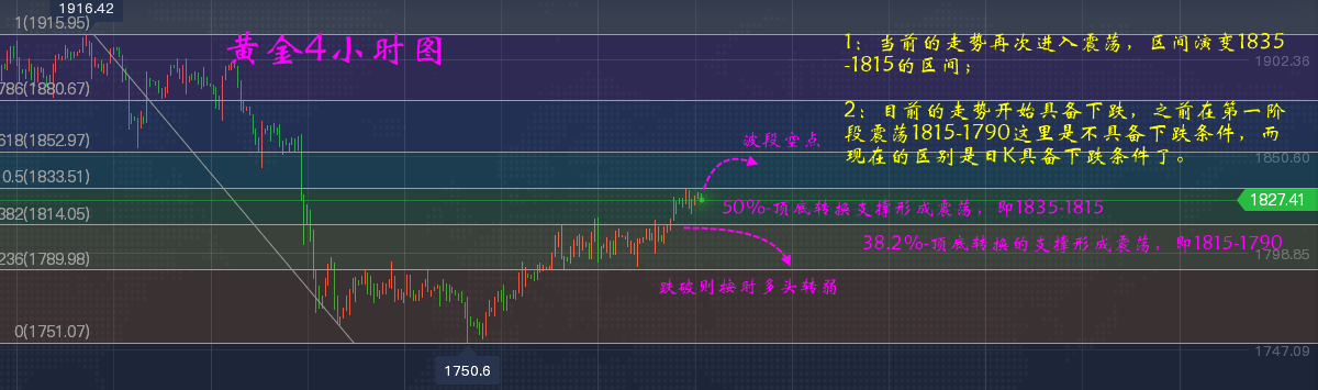 2:4小时图中目前在死叉,但是不要被死叉带偏了,因为顶底转换的支撑分别是1815和1790的支撑;死叉带动跌破1815,是说明多头转弱;跌破1790说明空头发力;破1750-1760才是空头开启下跌;