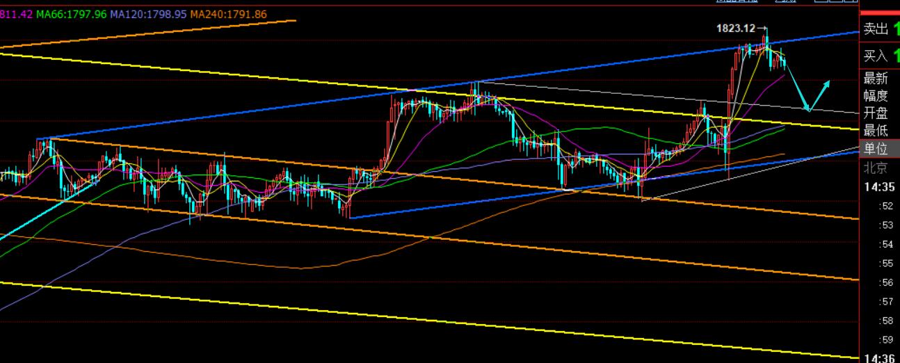 第三,22点后,鲍威尔讲话过于鸽派性,促使金价一路走强,突破了关键1805-06短期承压,冲击1818-19一线,视频中也指出,一旦利多则容易试探预备的蓝色上轨压力1818-20;