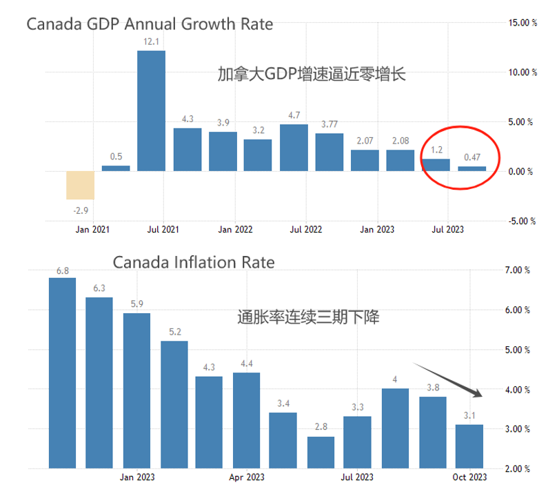 本周三23:00,加拿大央行将公布至12月6日央行利率决定,市场普遍预期将维持5%的基准利率不变。今年三季度,加拿大的GDP增速年率仅为0.47%,远低于前值的同时逼近零增长水平。10月份CPI年率增速3.1%,已经连续三期下降,如果未来跌破3%关口,则进入温和通胀区间。另外,近期国际油价表现疲软,加拿大经济受负面影响,加拿大央行暂停加息以观察宏观经济运行的概率极高。由于美元指数处于空头趋势之中,无论加拿大央行是否加息,加元大概率都将中期走升。