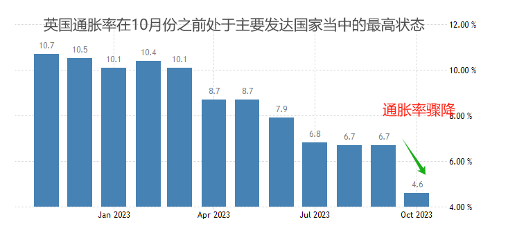 本周四20:00,英国央行将公布12月份利率决议结果,市场普遍预期英央行将暂停加息,并将基准利率维持在5.25%。预期暂停加息的理由有两方面,其一是英央行已经连续两期暂停加息,从趋势角度看,12月份也不大可能加息。其二是英国的高通胀局面已经出现巨大改变。9月份英国CPI年率高达6.7%,处于主要发达经济体当中最高通胀率的状态,但是,10月份英国CPI年率骤降至4.6%,意味着通胀率开始出现急速下行,高通胀将会持续的预期被打破。对于英央行来说,暂停加息,维持限制性利率,观察主要经济数据的变化是最佳选择。