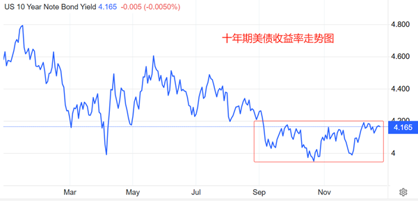 债券市场来看,最近四个月,美债收益率保持横盘震荡态势,上限4.19%,下限3.95%。美国联邦基金利率区间为3.5~3.75%,按照上限比较,两者相差44基点。从长周期看,美联储的货币政策偏紧缩,但紧缩程度较弱。一年期美债收益率为3.52%,与联邦基金利率下限相近,意味着美联储短期内再次降息的概率较低。