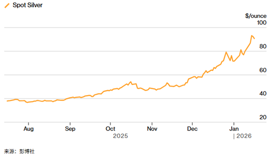 本周现货白银价格一度飙升至每盎司93美元以上的历史新高,较去年同期上涨了两倍多,有望连续第九个月上涨——是自1950年有记录以来最长的连涨纪录。