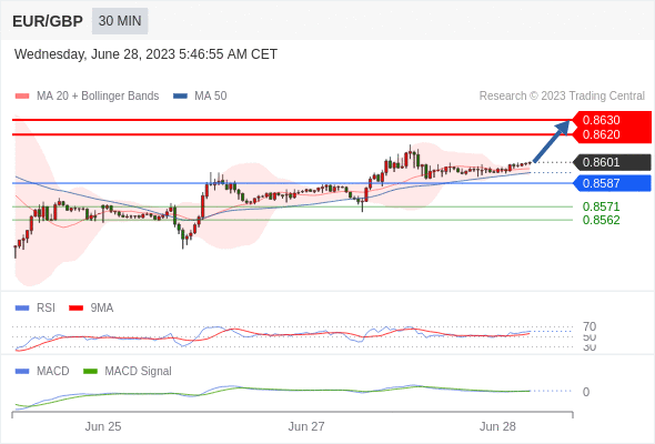 欧元/英镑 当日内: 看涨,当 0.8587 为支撑位。