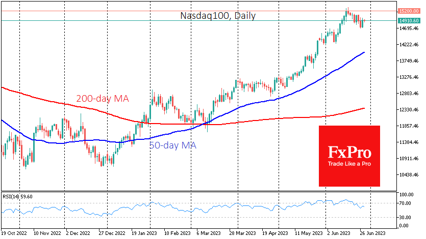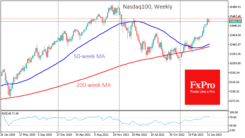 技术面也表明,至少在短期内会下降。纳斯达克 100 指数在 15200 点上方创局部峰值,去年 3 月和 2021 年 8 月也出现了逆转。在每日时间范围内,相对强弱指标(RSI) 已从超买区域回落,这标志着修正的开始。在每周的时间范围内,它接近类似的信号。如果全面修正,纳斯达克100指数可能会在年底前升至12100-12500点,保持长期上升趋势不变,保持在200周移动均线上方,但会消除过度的乐观情绪。
