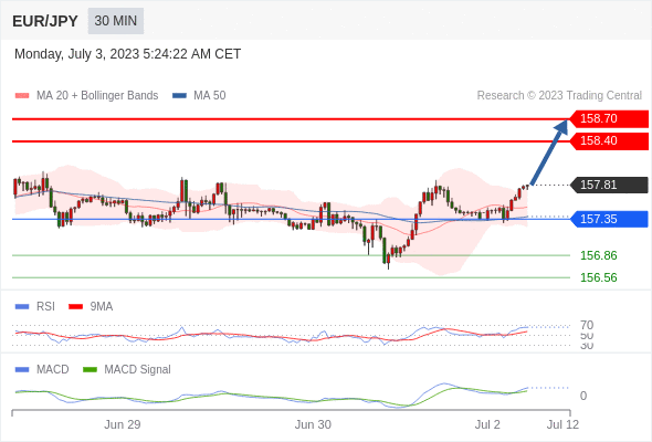 欧元/日元 当日内: 看涨,当 157.35 为支撑位。
