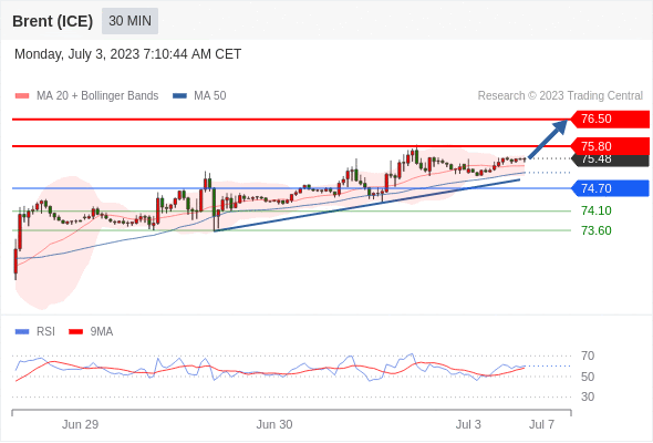 在 74.70 之上,看涨,目标价位为 75.80 ,然后为 76.50 。