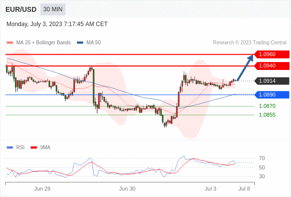 在 1.0890 之上,看涨,目标价位为 1.0940 ,然后为 1.0960 。