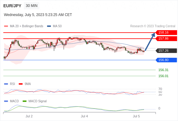 欧元/日元 当日内: 有上涨的可能,目标价位定在 158.16 。