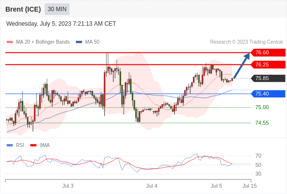 在 75.40 之上,看涨,目标价位为 76.25 ,然后为 76.60 。