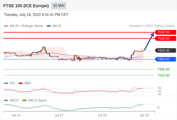 如跌破 7404.50 ,英国富时100指数期货 目标方向定在 7345 和 7310 。