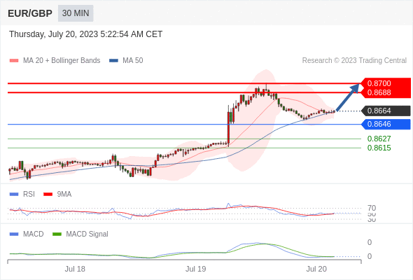 欧元/英镑 当日内: 看涨,当 0.8646 未被跌破。