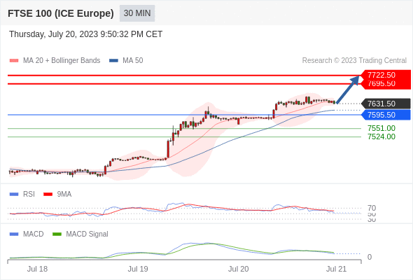 如跌破 7595.50 ,英国富时100指数期货 目标方向定在 7551 和 7524 。