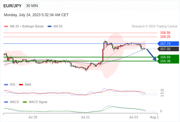 欧元/日元 当日内: 当 157.73 维持阻力位时,看跌,目标锁定在 156.38 。