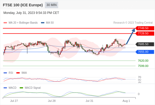 看涨,当 7655 为支撑位,目标定在7749.50。