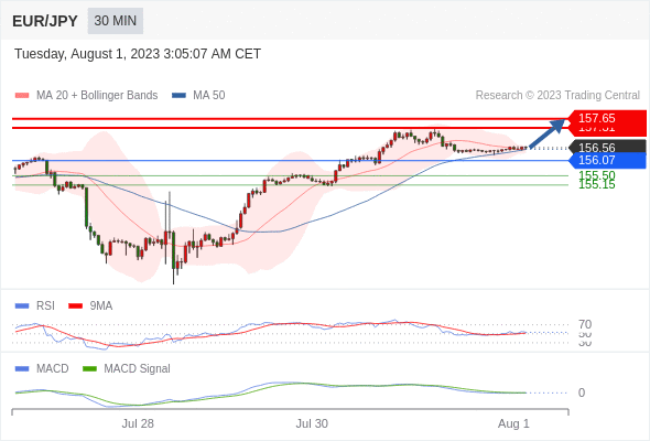 欧元/日元 当日内: 看涨,当 156.07 为支撑位,目标定在157.65。