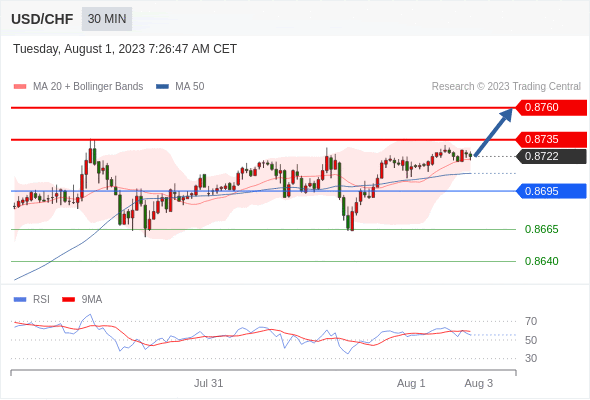 在 0.8695 之上,看涨,目标价位为 0.8735 ,然后为 0.8760 。