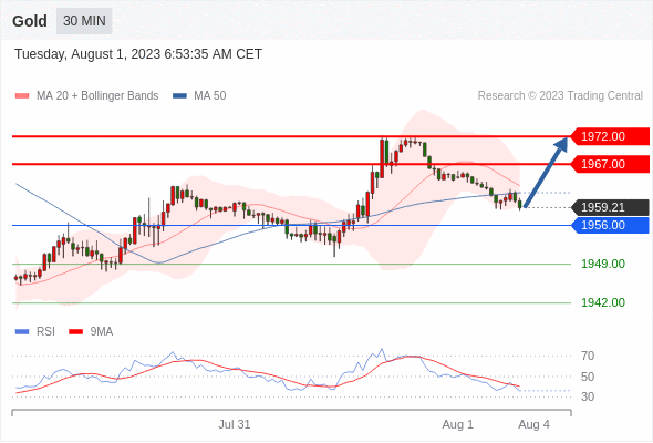 在 1956.00 之上,看涨,目标价位为 1967.00 ,然后为 1972.00 。