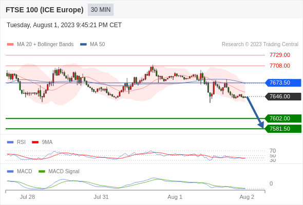 英国富时100指数期货 当日内: 看跌,在 7673.50 之下。