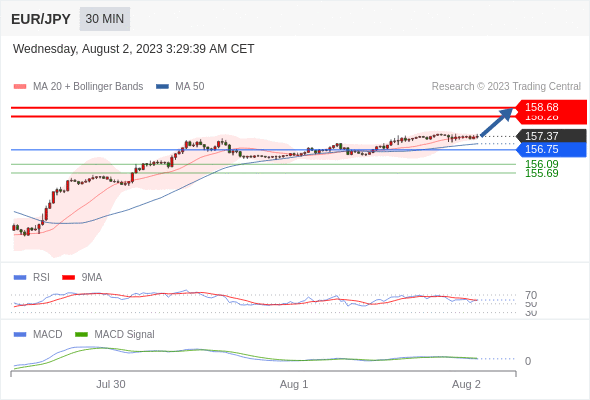 欧元/日元 当日内: 看涨,当 156.75 为支撑位,目标定在158.68。