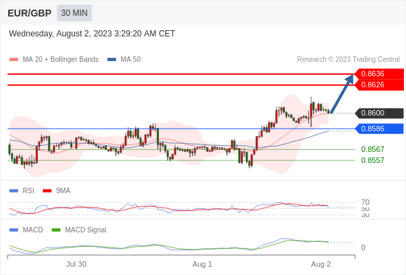 欧元/英镑 当日内: 看涨,当 0.8586 为支撑位,目标定在0.8636。