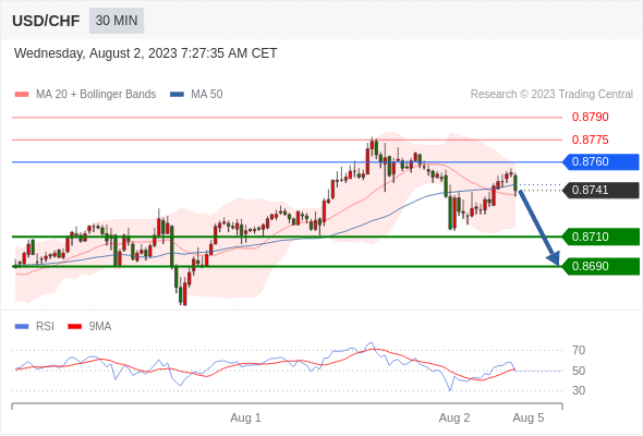 美元/瑞郎 当日内: 短期关键阻力位在0.8760。