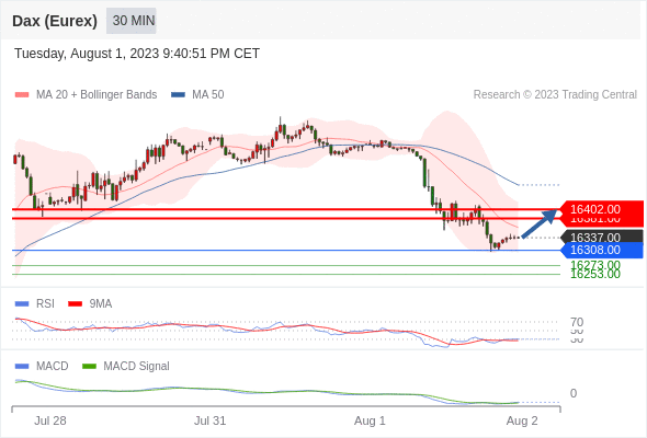如跌破 16308 ,德国DAX指数期货 (Eurex) 目标方向定在 16273 和 16253 。