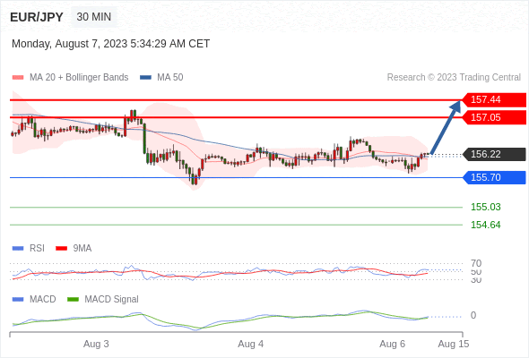 欧元/日元 当日内: 看涨,当 155.70 未被跌破。