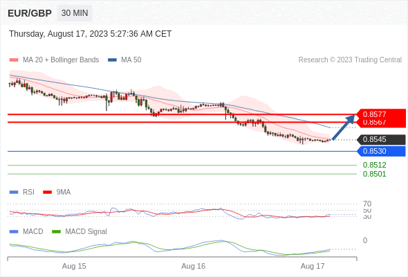 RSI技术指标低于50。 MACD技术指标呈现看跌状态并 处在其信号线的上方。 此外,价位处在其20天及50天移动平均线下方 ( 当前是 0.8546 和 0.8560 )。